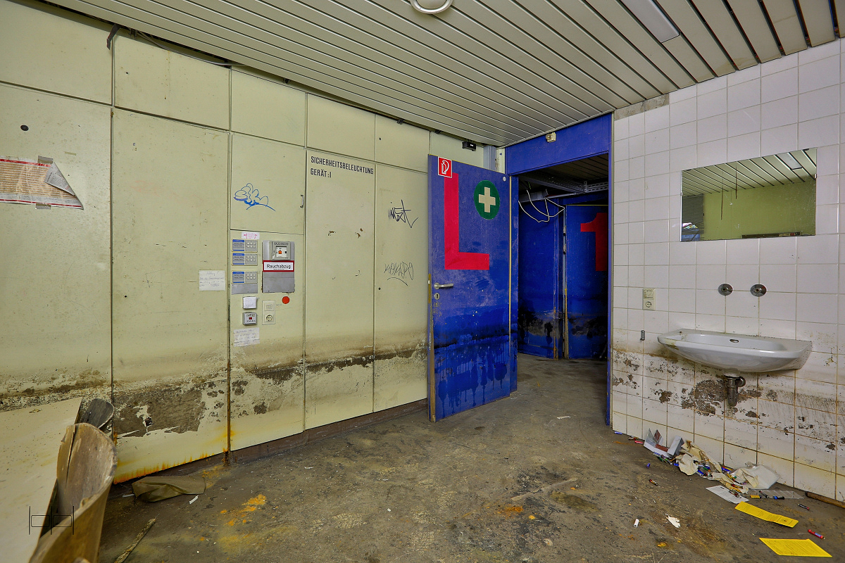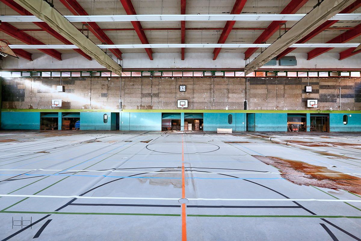 Vorbei an Technik- und Sprinklerzentrale, gelangt man unterirdisch über einem Tunnel vom Schulgebäude zur Turnhalle. Da die Turnhalle unterhalb der Erdoberfläche errichtet wurde, liegen die Umkleide- und Waschräume, Aufsichtsraum und der Notausgang im Kellerbereich.